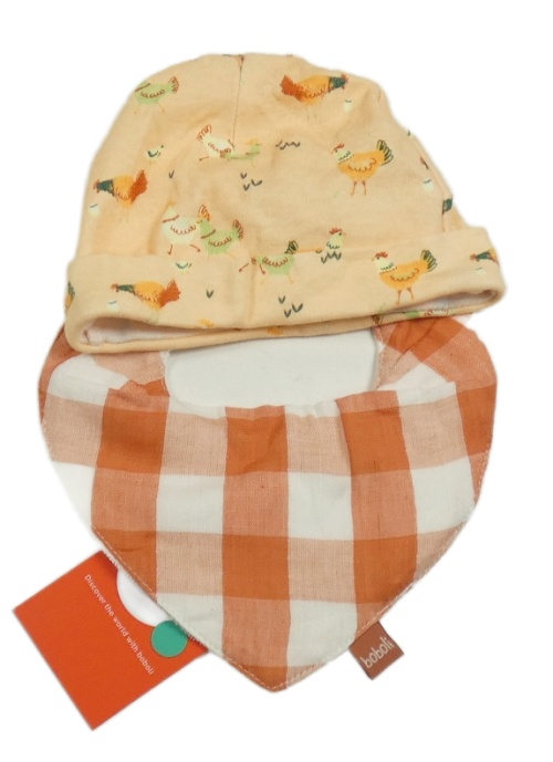 Nové - 2 set - žltá čapica so slepicemi + bílo-cihlový kostkovaný slinták