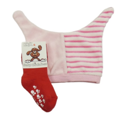 2 set - ružová zamatová čapica s pruhy + červené ponožky s protiskluzem