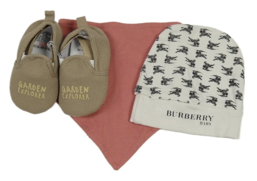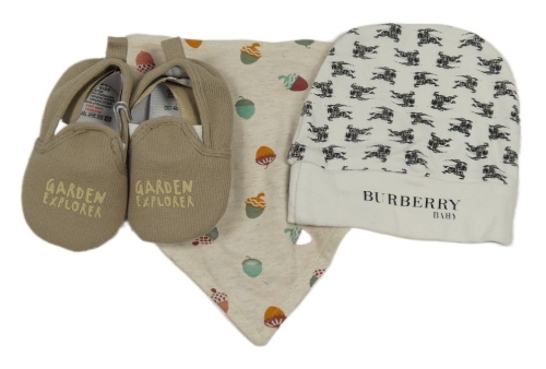 3 set - béžové cápačky s nápisem + bílá čepice - Burrberry + oboustranný slinták