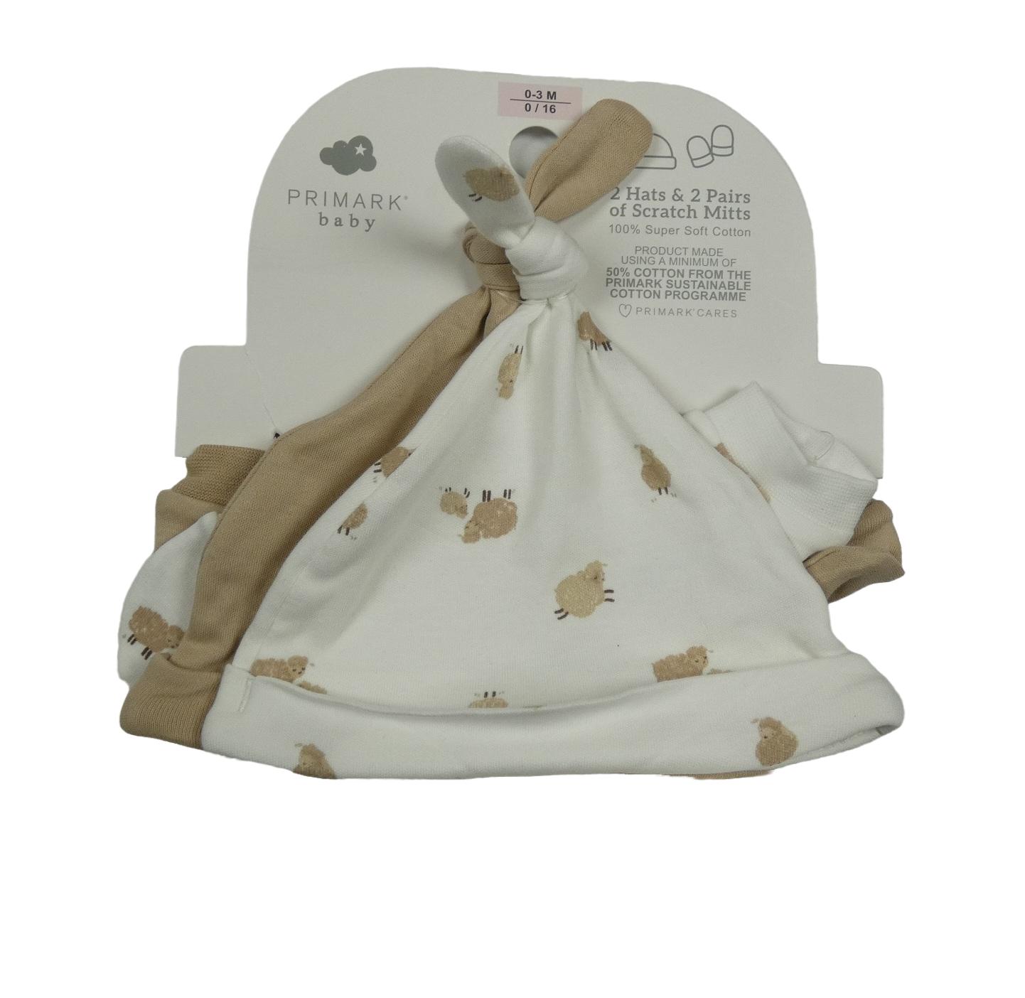 4 set - 2x bielo-hnedá bavlnená čapica s ovečkami + bílo-hnědé bavlněné rukavice Primark
