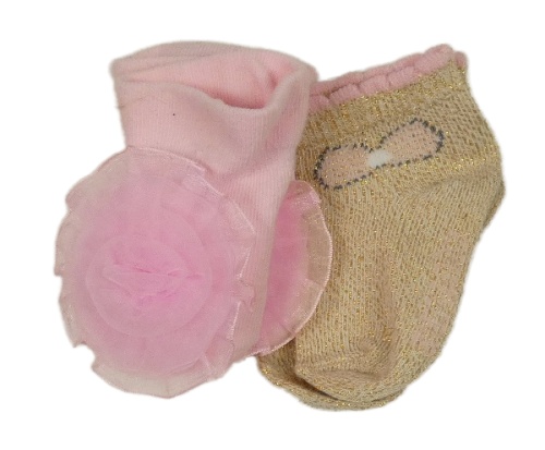 2set - 2x ponožky - zlaté trblietavé s mašlí + růžové s 3D kvety