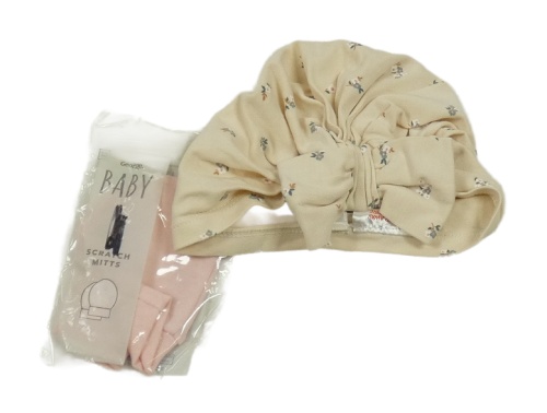 2set - Béžová kvetovaná čapica s mašlí + růžové rukavice