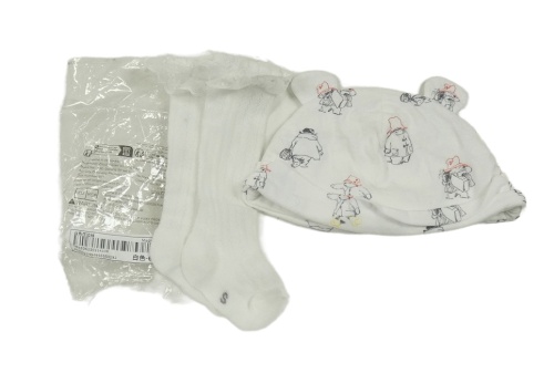 2 set - bílé podkolenky s volánkem + biela čapica s obrázkami