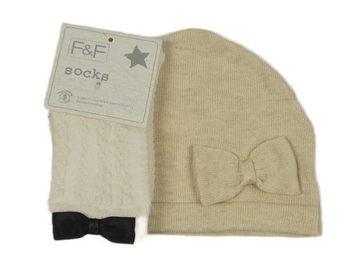 Nové - 2set - Béžová úpletová čapica s mašlí + smotanové vzorované ponožky