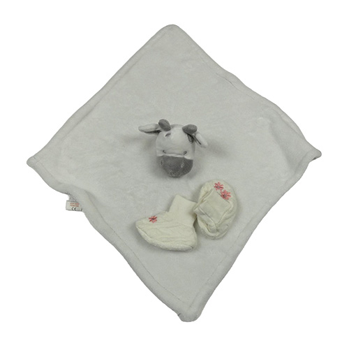 • 2set - Bílý chlupatý usínáček s krávou + smotanové pletené cápačky s výšivkami květů