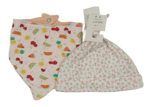 2 set - bílá květovaná čepice + bílo-oranžový slinták s ovociem