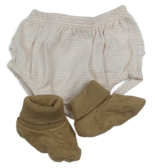 Nové - Broskvovo-biele pruhované kraťasy + béžové pletené cápačky