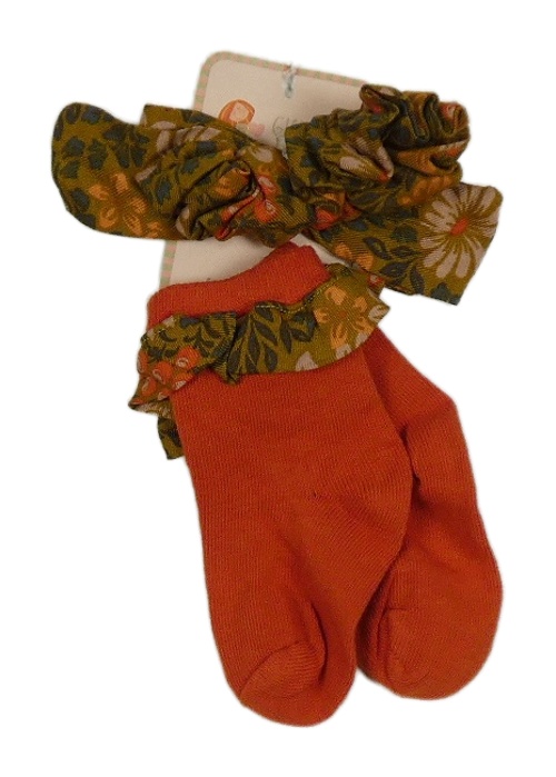 Nové - Tehlové ponožky s volánkem + zelenohnědá kvetovaná čelenka