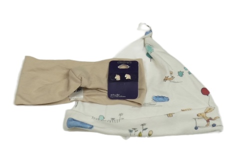Nové - 3set - Biela čapica s obrázky + béžová čelenka + náušnice jednorožec