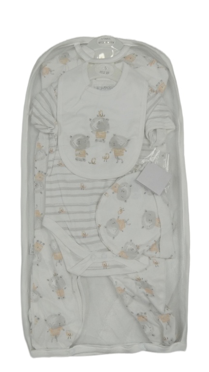 Nové - 5set - Biely overal s medvídky + body + bryndák + čepice + rukavice