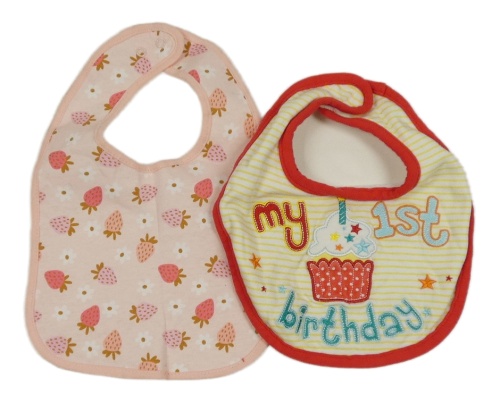 2set - 2x bryndák - růžový s jahodami + žlto-bielo-červený podbradník s nápisom a muffinem