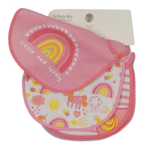 • Nové - 5x bryndák - růžový s duhou + bílý s duhami a jednorožci + růžový +bílo-růžový pruhovaný s jednorožcem + bílý květovaný Dunnes