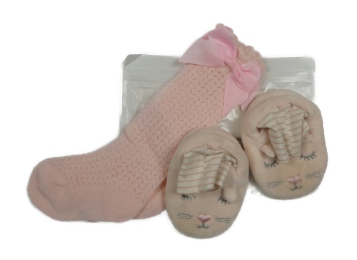 2set - Růžové perforované podkolenky s mašlí + chlpaté cápačky s čumákem vel. 17