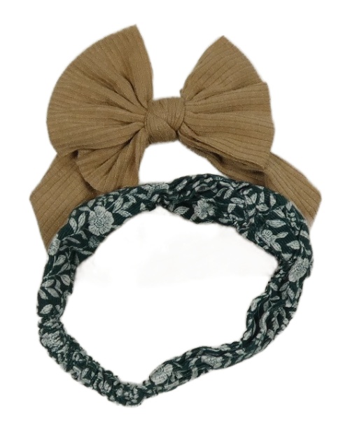 2x - Žebrovaná čelenka - Smaragdová manšestrová s kytičkami, hnedá s mašlou