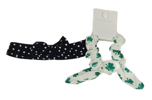 • Nová - 2Set - Tmavomodrá čelenka s bielými hviezdičkami a mašlou Peacocks + bílá gumička s trojlístky PRIMARK
