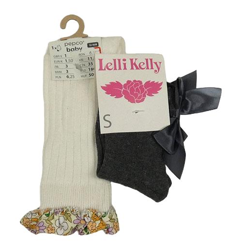 Nové - 2x ponožky - smetanové žebrované podkolenky s květovaným volánem + tmavošedé melírované s mašľami