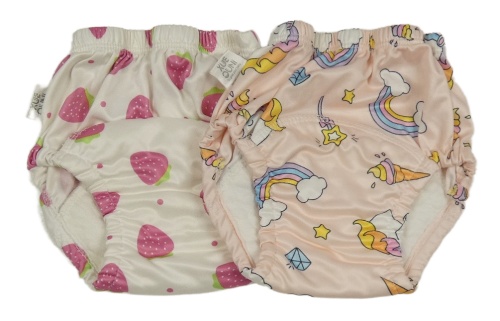 2x tréninkové kalhotky - smetanové s jahodami + světlerůžové s duhami