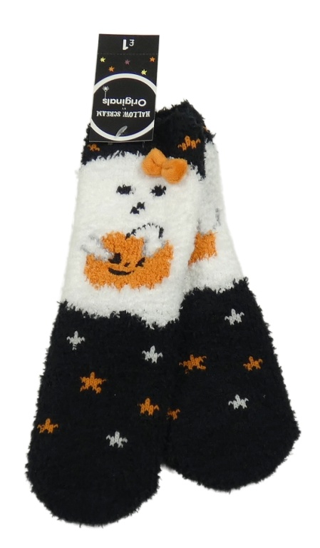 • Nové - Čierno-biele chlpaté ponožky s duchem s tekvicou