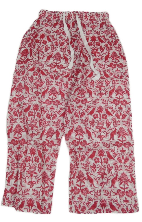 Bielo-malinové ľahké nohavice so zvieratkami a kvietkami
