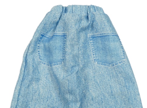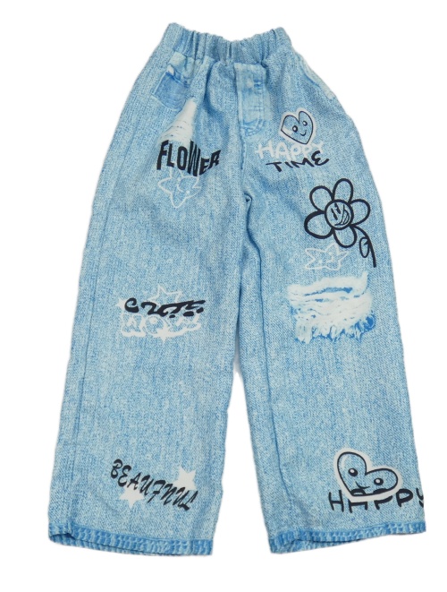 Modro-bílé wide leg kalhoty riflového vzhledu s nápismi a srdiečkami a květem