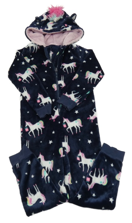 Tmavomodrá chlpatá kombinéza s jednorožcami a kapucňou