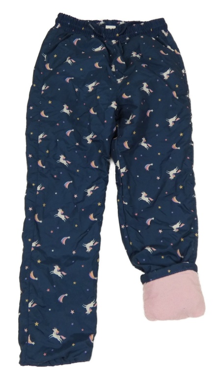 Tmavomodré šušťákové zateplené nohavice s jednorožcami