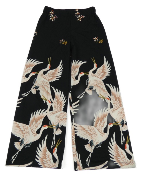 Čierno-farebné ľahké wide leg nohavice s ptáky a kvetinami