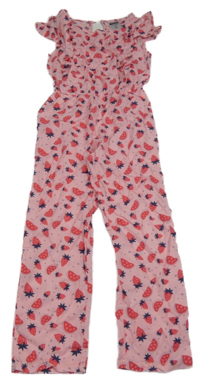 Ružový nohavicový overal s ovociem a volánikmi