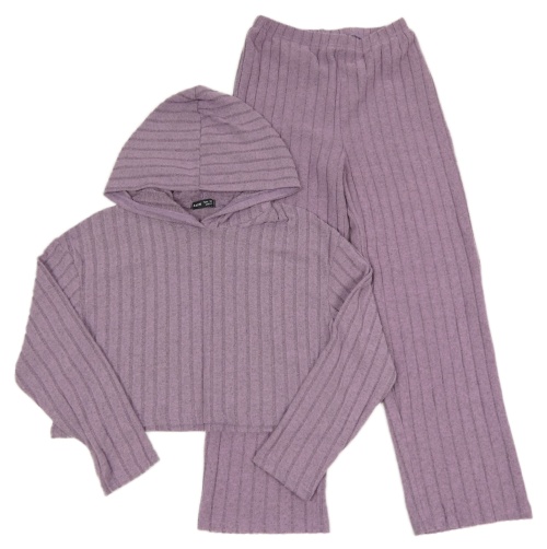 2set - Lila rebrované crop úpletové tričko s kapucí + nohavice Shein