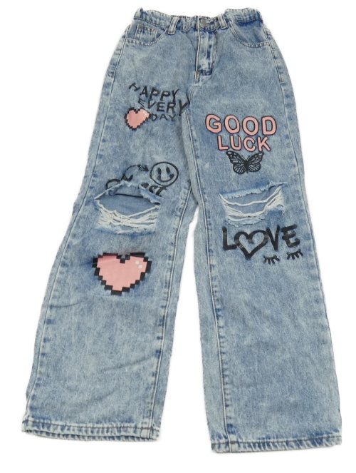 • Modro-biele plesňové wide leg rifle s nápismi a motýlkom a smajlíkom a děravými koleny SHEIN
