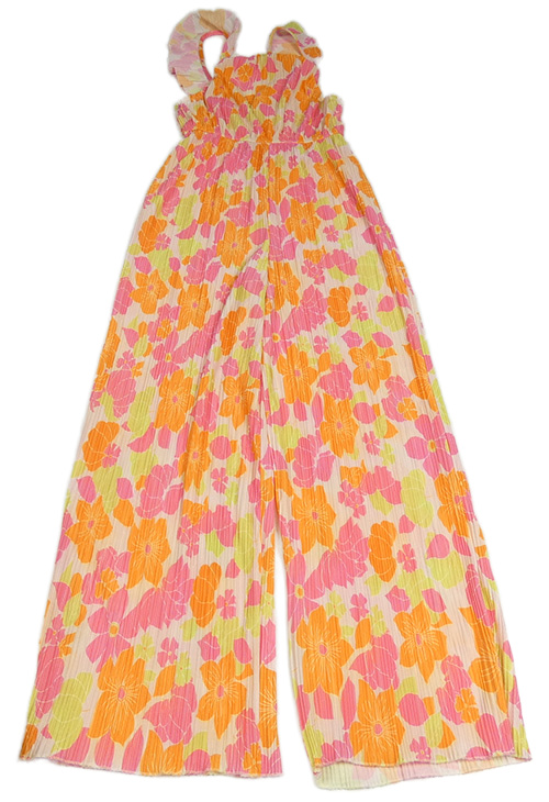 Svetloružová -oranžovo-ružový kvetovaný plisovaný nohavicový culottes overal s volánikmi ZARA