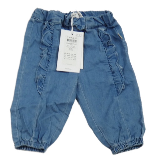 Modré lehké kalhoty riflového vzhledu s volánikmi a mašlou Name it
