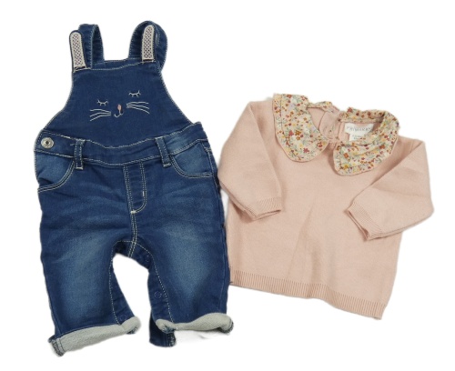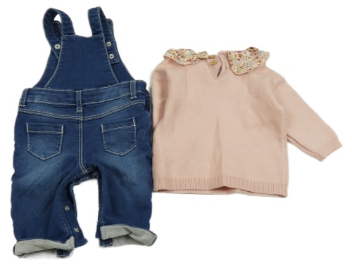 2Set - Tmavomodré teplákové rifľové na traké nohavice s čumáčkem + svetloružový sveter s golierikom s kvietkami PRIMARK