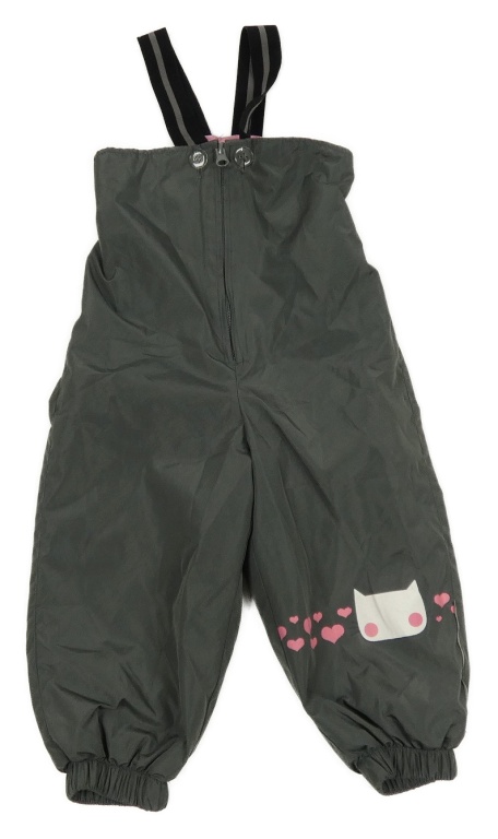 Tmavosivé šušťákové zateplené nohavice s trakami s mačkou