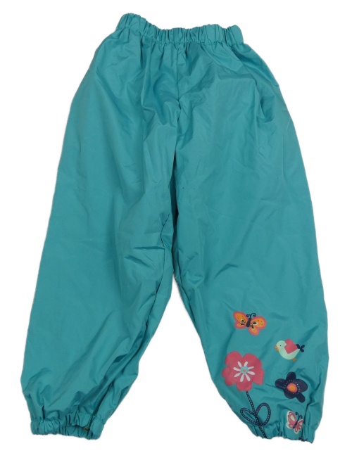 • Modrozelené šušťákové nepromokavé podšité nohavice s kvietkami a motýlikmi a vtáčikom