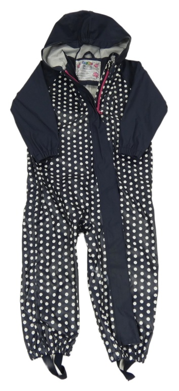 Tmavomodrá nepromokavá kombinéza s bodkami a kapucňou lupilu