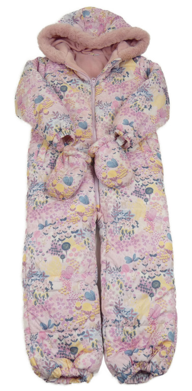 • Ružovo-modro-žltá kvetovaná vzorovaná šušťáková zimná kombinéza so zvieratkami a kapucí + rukavice Dunnes Stores
