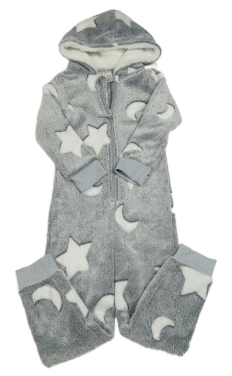 Sivo-biela plyšová kombinéza s hviezdičkami a mesiacmi a kapucňou Peacocks