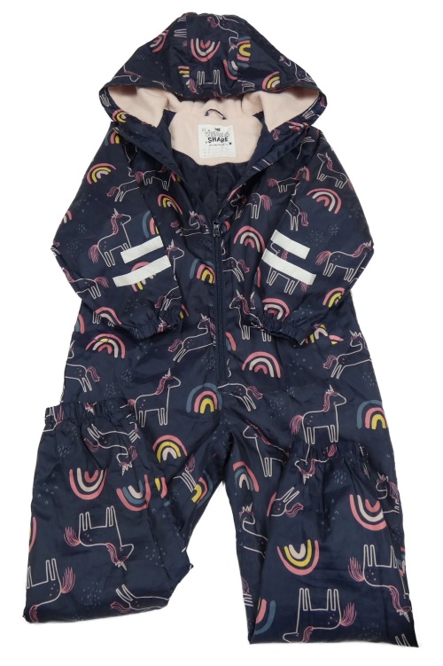 Tmavomodrá šušťáková jarná kombinéza s jednorožci, duhami a kapucí F&F