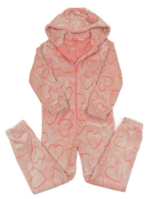 Neónově korálovo-biela plyšová kombinéza so srdiečkami a kapucňou s brmbolcom Nutmeg