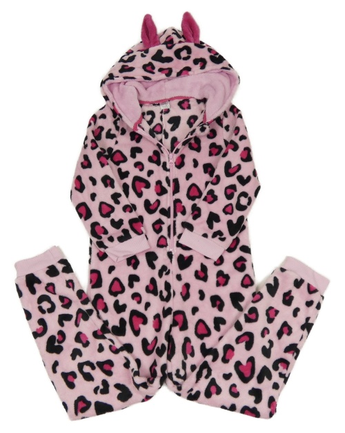 Ružovo-čierna plyšová kombinéza s leopardím vzorom a kapucňou