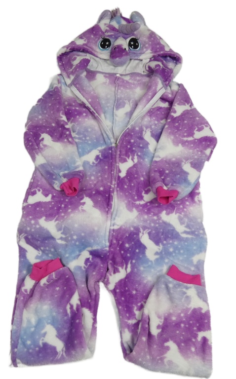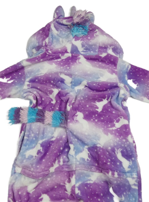 Purpurovo-modro-tmavoružová plyšová kombinéza s jednorožcami a kapucňou