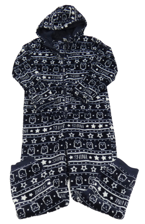 Tmavomodro-biela vzorovaná plyšová kombinéza so sovičkami a hviezdičkami a kapucňou YIGGA