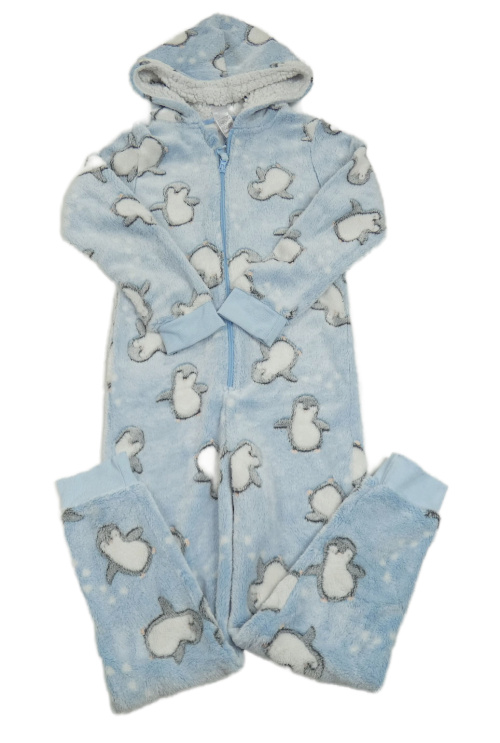 Svetlomodrá chlpatá kombinéza s tučňáky s kapucňou Peacocks