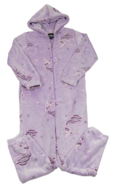 Levandulová chlpatá kombinéza s jednorožcami a kapucňou