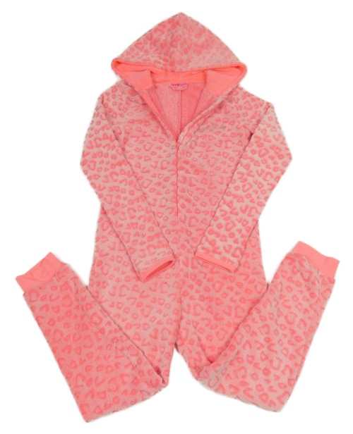Kriklavoě korálovo-biela vzorovaná plyšová kombinéza s nápisom a kapucňou s uškami Y.F.K.