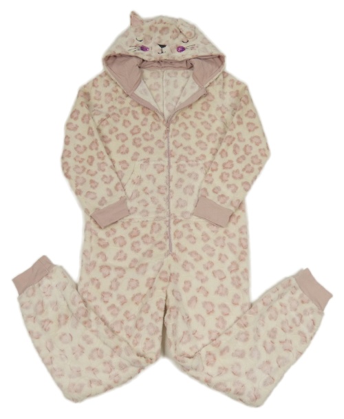 Smetanovo-ružová vzorovaná plyšová kombinéza so srdiečkami a kapucí - mačička s flitrami Nutmeg