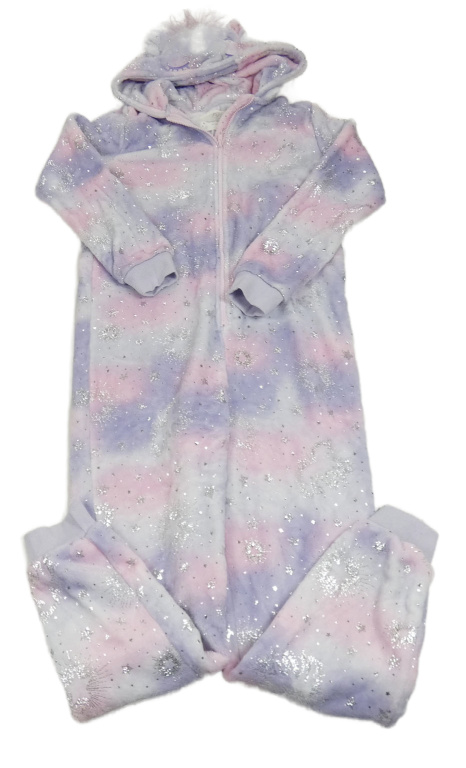 Fialovo-svetloružová vzorovaná chlpatá kombinéza s jednorožcami a kapucňou F&F