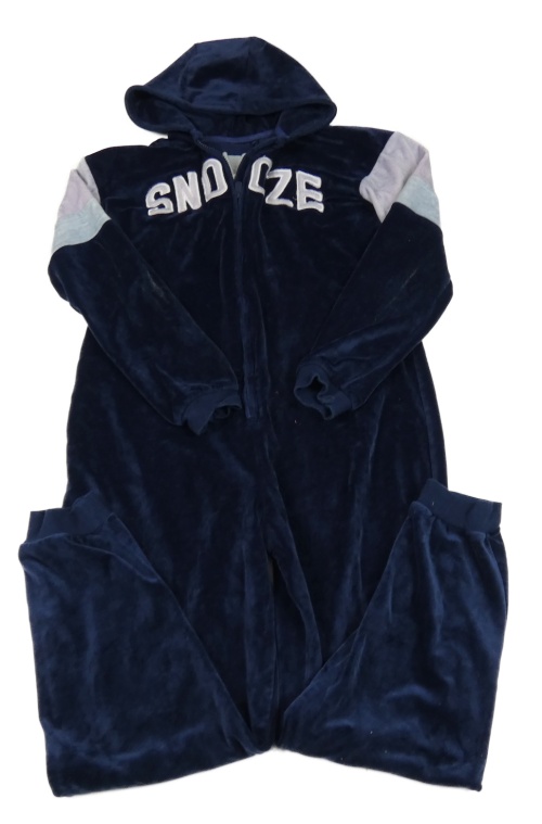 Tmavomodro-lila-sivá plyšová kombinéza s nápisom a kapucňou George