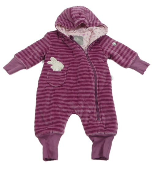 Fialová pruhovaná zamatová zateplená kombinéza s králikom a kapucňou
